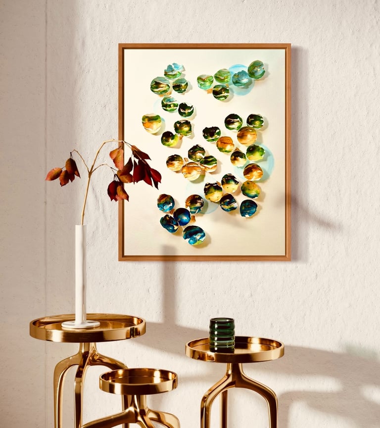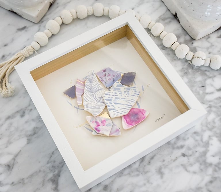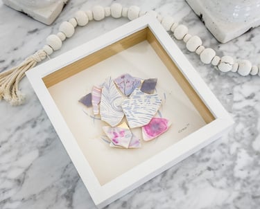 Each piece is created from hand-painted and broken eggshells, then reassembled into a luminous mosaic that mirrors the natural rhythm of the shoreline. Gentle yet complex, The Shallows invites the viewer to pause, reflect, and find stillness in transformation.