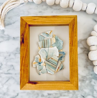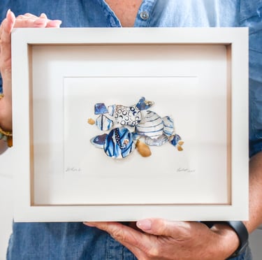 Created from delicate chicken eggshells, the series is inspired by a summer spent on Lake Erie watching the way sunlight bounced off the water and noticing the shift from brilliant blues into the deep forest greens of autumn. The palette reflects this seasonal transition: warm raw sienna, a custom-mixed indigo, and earthy sap green. This series invites calm and wonder — perfect for art lovers drawn to subtle textures and soulful colour.