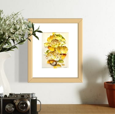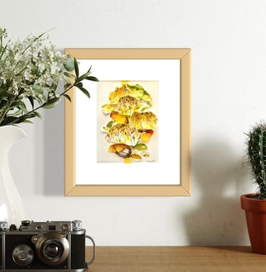 Created from delicate chicken eggshells, the series is inspired by a summer spent on Lake Erie watching the way sunlight bounced off the water and noticing the shift from brilliant blues into the deep forest greens of autumn. The palette reflects this seasonal transition: warm raw sienna, a custom-mixed indigo, and earthy sap green.