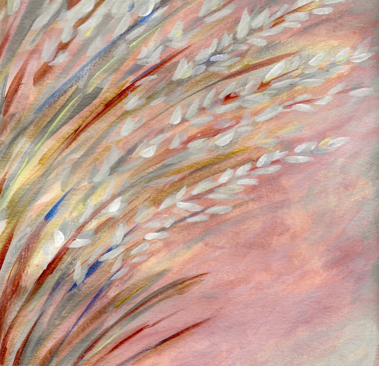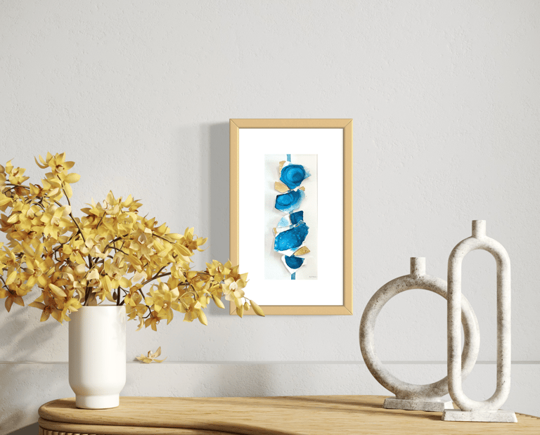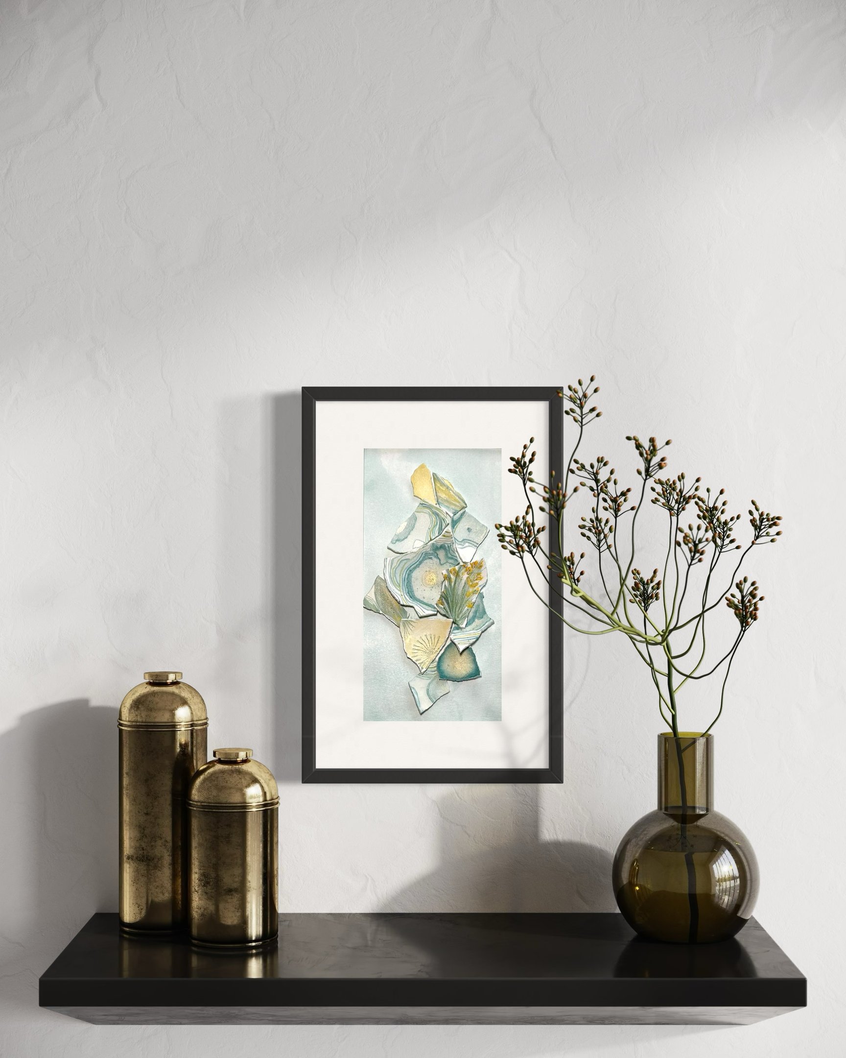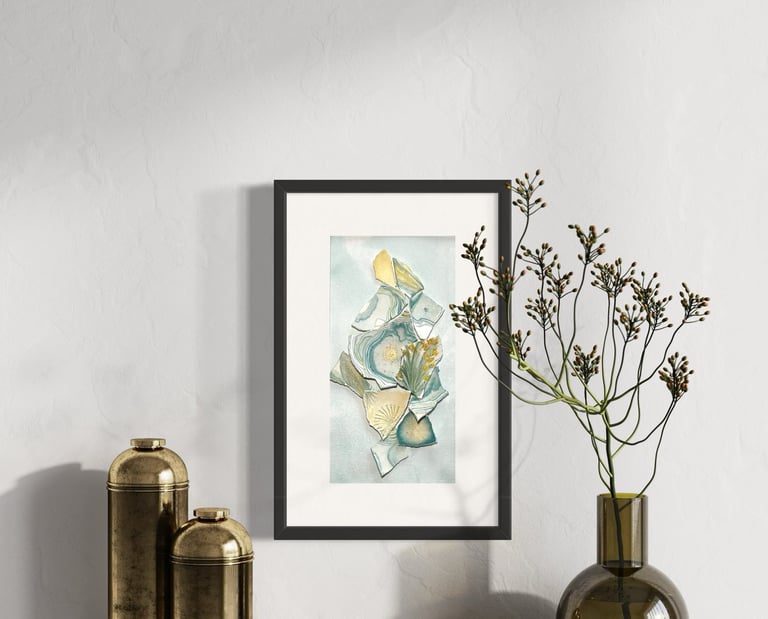 This series is inspired by the living rhythm of the riverbanks, where every reflection tells a story of connection between earth and water. Created with hand-painted ostrich eggshells, ink, and gold leaf, each piece captures the gentle movement and balance found in nature’s small moments. The beauty that exists right in front of us when we slow down and look. Layers of colour echo riverbanks, wild florals and shifting light. Framed and ready to hold space.