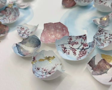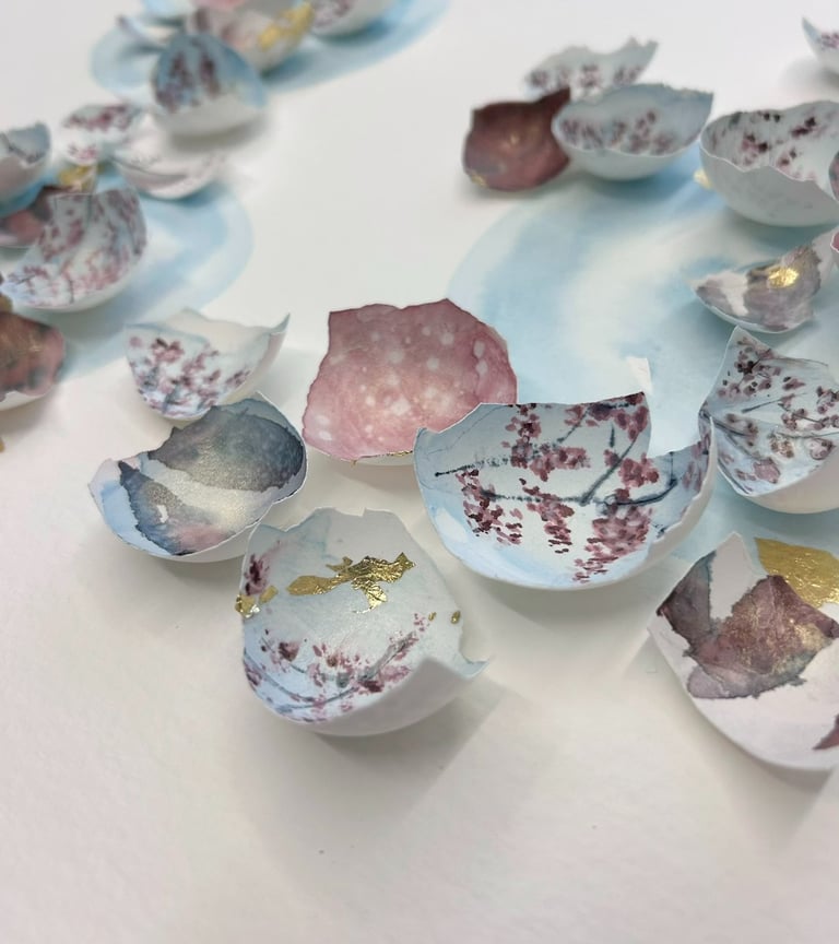 Each piece is created from hand-painted and broken eggshells, then reassembled into a luminous mosaic that mirrors the natural rhythm of the shoreline. Gentle yet complex, The Shallows invites the viewer to pause, reflect, and find stillness in transformation.