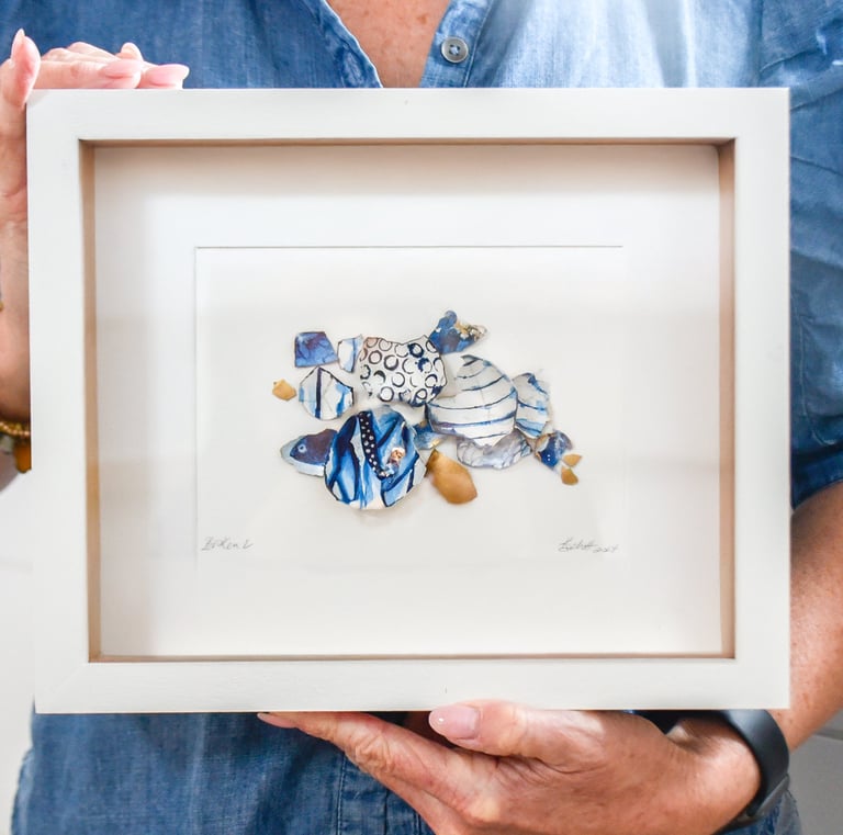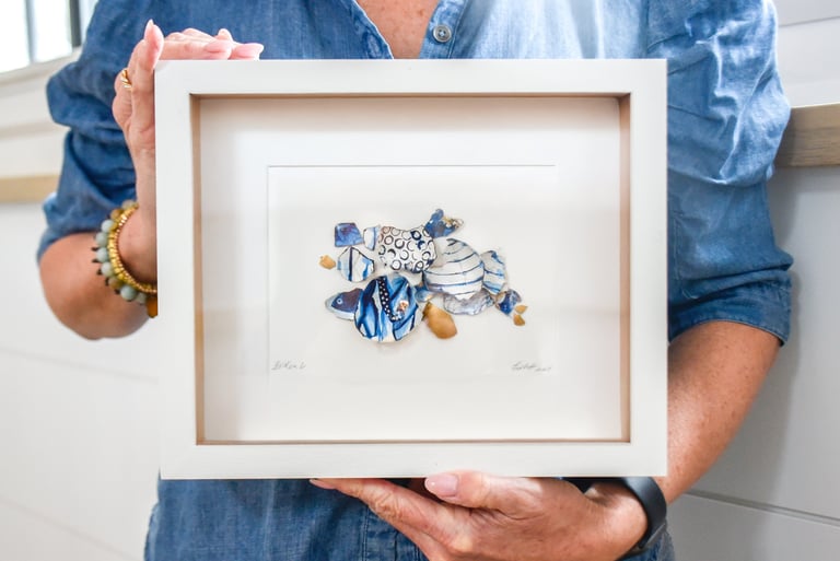 Created from delicate chicken eggshells, the series is inspired by a summer spent on Lake Erie watching the way sunlight bounced off the water and noticing the shift from brilliant blues into the deep forest greens of autumn. The palette reflects this seasonal transition: warm raw sienna, a custom-mixed indigo, and earthy sap green. This series invites calm and wonder — perfect for art lovers drawn to subtle textures and soulful colour.